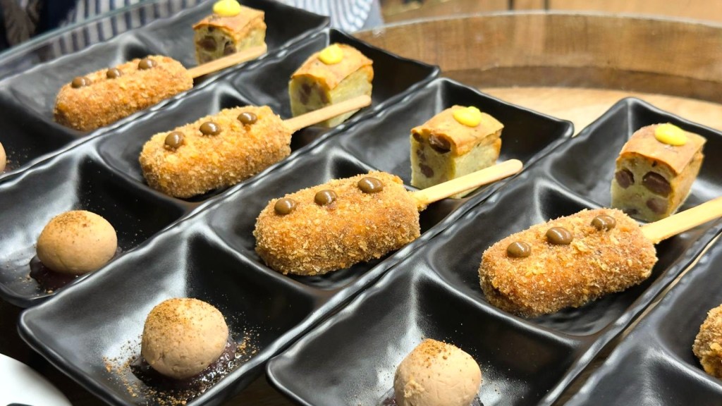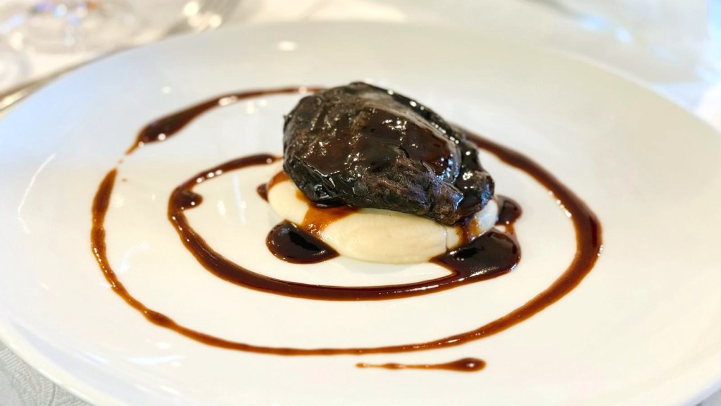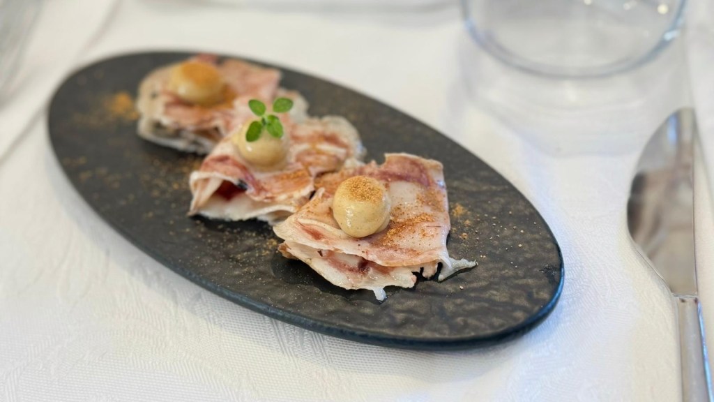 Il nostro pranzo è cominciato con un aperitivo in enoteca, ricco di sapori e originalità: una polpettina di pecora alla callara su crema di cipolla caramellata; un “magnum” di riso e salsiccia, panato e fritto, servito con una salsa di aglio nero fermentato prodotta da loro; e un flan di porchetta con maionese allo zafferano, davvero degno di nota — il tutto esaltato dalla loro fresca e gradevole Passerina Brut metodo Martinotti.
