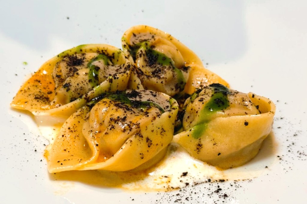 Tra i piatti serviti, due referenze su tutte meritano menzione. La coppa di testa artigianale — una delle migliori che abbia mai assaggiato: ricca, intensa, autentica, tagliata molto sottile, che ho apprezzato moltissimo — e soprattutto il piatto simbolo della tenuta, il tortello di ventricina con pecorino a scorza nera, clorofilla di prezzemolo, gel di sarde e polvere di cipolla bruciata. A prima vista la quantità di ingredienti può spaventare, ma vi assicuro che è una vera goduria: un piatto manifesto, non presente nel menù à la carte ma riservato agli eventi, che racchiude tradizione e creatività, equilibrio e audacia.